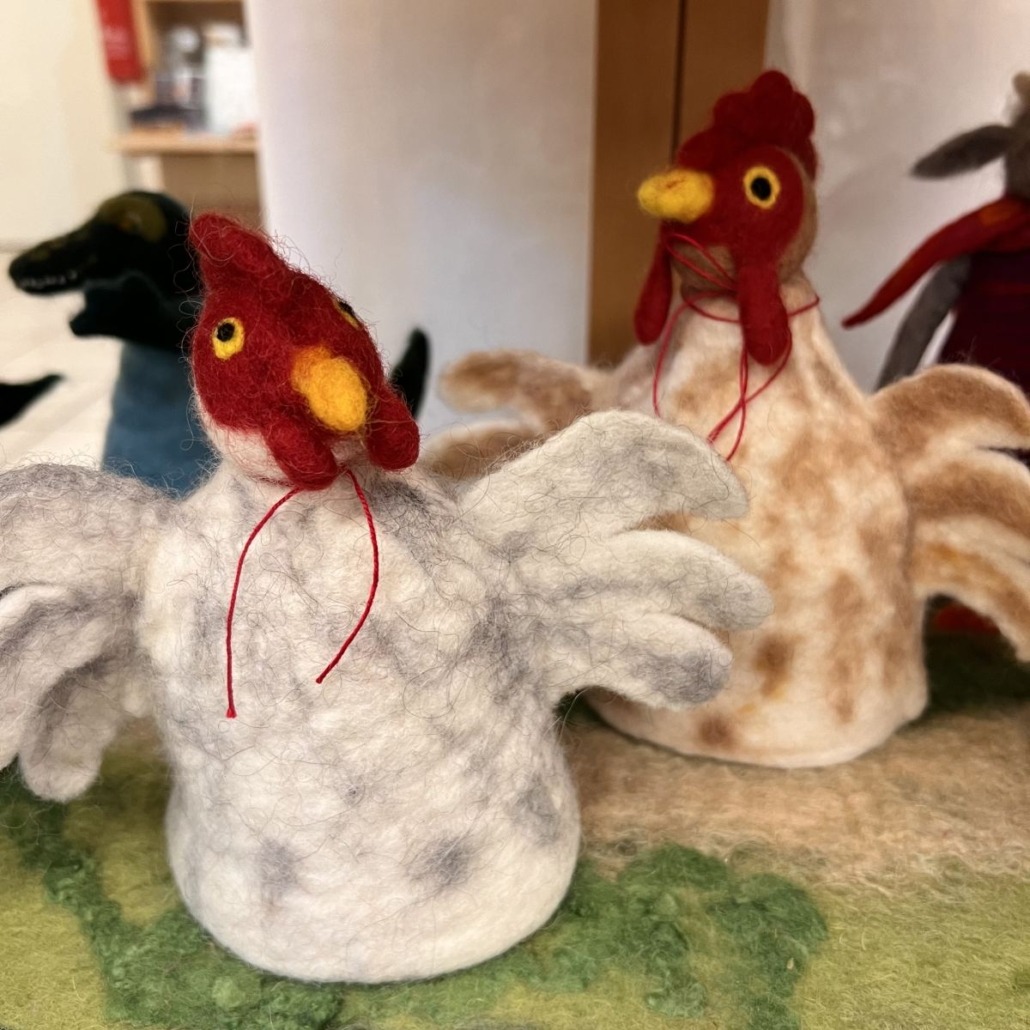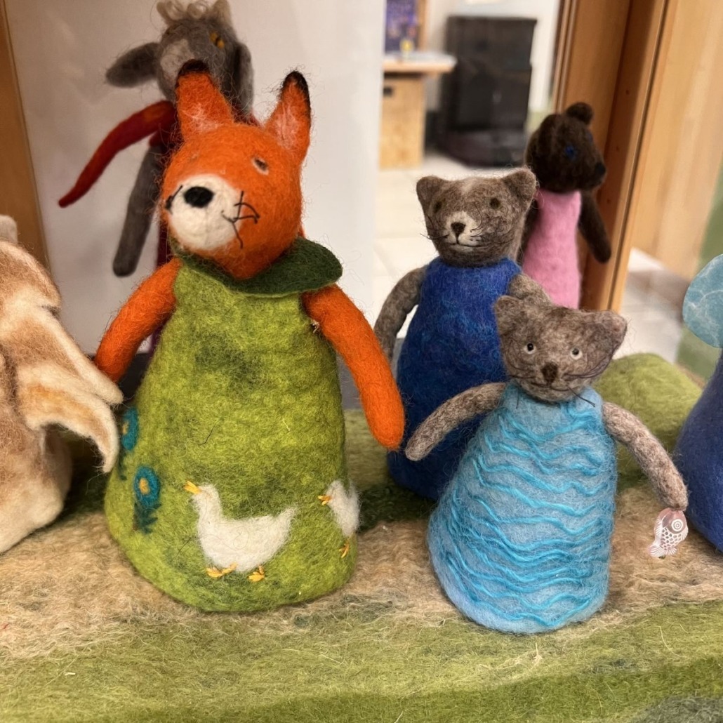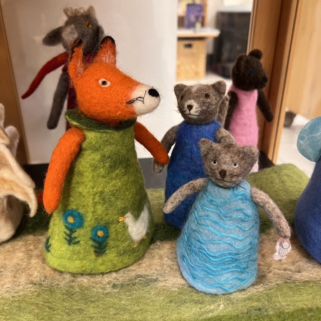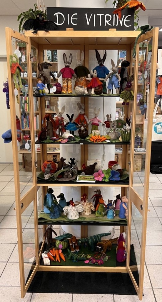 Gabriele Conen filzt für ihr Leben gerne. Alleine, mit Kindern, mit Erwachsenen. Zuhause, in ihrer Werkstatt, im Kindergarten oder in der Schule. Und nun hat sie eine Ausstellung in der Vitrine der Bücherträume, wo Ihr ab sofort kreative Filzgeschenkideen findet. Verschiedene Tiere und Figuren eignen sich für alle Jahreszeiten und besonders zu Ostern gibt es natürlich auch Hasen und Hühner für die passende Deko.